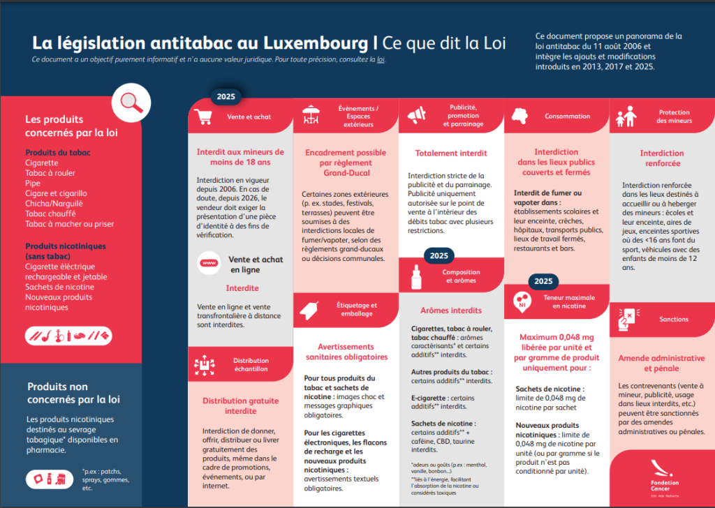 Fondacija Kanser Luksemburg objavila je detaljnu infografiku koja objašnjava novi zakon, dostupnu na sajtu maviesanstabac.lu. Materijal je namenjen građanima, stručnjacima, opštinama i školskim ustanovama.